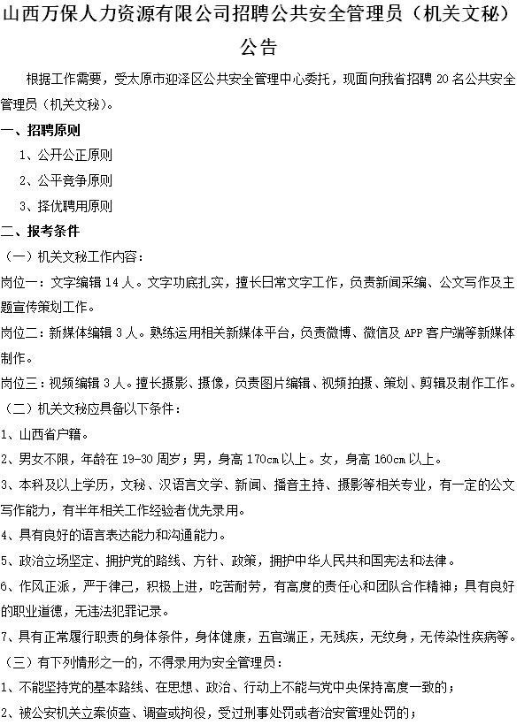 根據(jù)工作需要,經(jīng)古交市政府批準(zhǔn),現(xiàn)面向古交市公開(kāi)招聘輔助工作人員30名。招聘工作由山西萬(wàn)保人力...